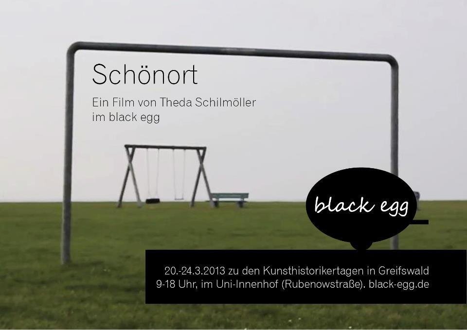 Die junge Künstlerin Theda Schillmöller konzipierte ihren kurzen Film, der in ein 300-Seelen-Dorf an der niedersächsischen Nordseeküste führt, als „Versuch eines realistisch-verklärten Heimatbildes“. Schönort gewann im vergangenen Jahr den Publikumspreis beim Kurzfilmfestival Goldener Toaster in Rostock sowie den ersten Preis bei der Insomnale 2012. Das Black Egg begleitet mit seinem Besuch den zeitgleich stattfindenden 32. Kunsthistorikertag.