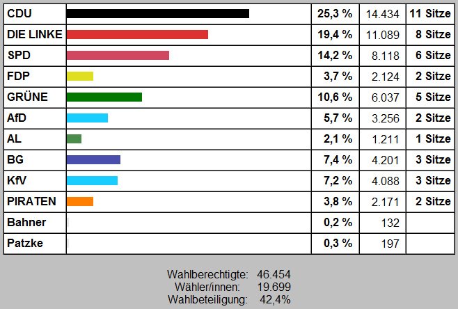 Trotzdem hat die CDU in der Bürgerschaft Federn gelassen und im Vergleich zur Kommunalwahl 2009 mehr als fünf Prozentpunkte verloren (25,3%), so dass die Fraktion nun nur noch über 11 Sitze statt über 13 Sitze verfügen wird. Auch DIE LINKE verliert zwei Sitze und wird trotz des zweitbesten Wahlergebnis (19,4%) in Zukunft nur noch 8 statt 10 Bürgerschaftssitze besetzen.