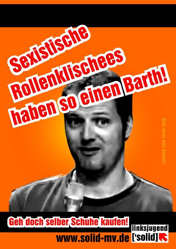 Zur Vorgeschichte: Die Linksjugend veröffentlichte unlängst Materialien mit dem Konterfei des durch seinen frauenfeindlichen Humor berühmt gewordenen Komödianten, die von der Feststellung „sexistische Rollenklischees haben so einen Barth“ flankiert wurden.