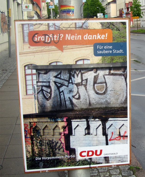 So meldete Mitte Mai die LINKE, dass sie von einem Bürger darüber informiert wurde, dass ihre Wahlplakate in der Ladebower Chaussee von Wahlkampfhelfern der CDU um 90° gedreht und damit für die Autofahrenden so gut wie nicht mehr wahrnehmbar gemacht worden seien. Pikantes Detail: Die plakatierenden Christkonservativen sollen mit einem Firmenwagen des CDU-Fraktionsvorsitzenden Axel Hochschild unterwegs gewesen sein. Eine Besichtigung vor Ort habe schließlich ergeben, dass „tatsächlich alle Plakate der LINKEN und FDP um 90 Grad gedreht wurden. Augenscheinlich nur an den Laternenmasten, wo die CDU vorher plakatiert hat.“ Hochschild soll später zwar telefonisch eingeräumt haben, dass man beim Plakatieren auch die Plakate anderer Parteien schon mal berühren oder bewegen würde, den Vorwurf des gezielten Drehens der Konkurrenzplakate habe der Malermeister aber vehement abgestritten. Nur eine Woche später meldet sich Hochschild in einer Pressemitteilung zu Wort, in der er feststellt, dass sich „Übergriffe“ auf CDU-Wahlplakate häufen würden. Besonders oft habe es Plakate mit dem Motiv „Graffiti? Nein danke!“ erwischt. Für den Fraktionsvorsitzenden ist der Fall klar: „Wir scheinen mit unserem Graffiti-Plakat den Finger in die Wunde gelegt zu haben“.