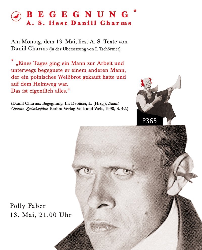 Auf die Ohren gibt es von A.S. gelesene, ins Deutsche übertragene Texte des russischen Literaten Daniil Charms. Die Veranstalter hoffen, mit dem „Klassiker des Absurden“ eine angemessene literarische Entsprechung zu den „skurrilen, phantasievollen, frechen, und oft tiefgründigen Collagen — ‚charming‘ im besten Charms’schen Sinne — bieten“ zu können.