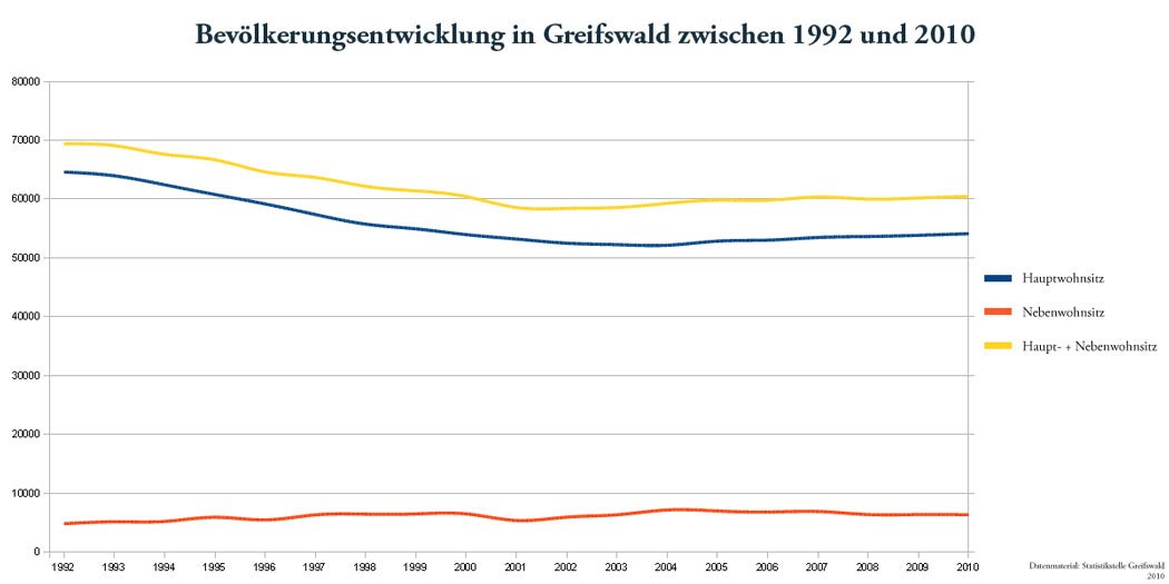 Die aktuellen Bevölkerungszahlen des Statistischen Landesamtes werden leider erst später veröffentlicht, so dass bisher nur bis 2010 vorliegen. Dort werden auch nur die Einwohner erfasst, die mit ihrem Hauptwohnsitz gemeldet sind. Am Beispiel Greifswald wird allerdings deutlich, wie beträchlich der Anteil nebenwohnsitzlich gemeldeter Bürgerinnen sein kann.