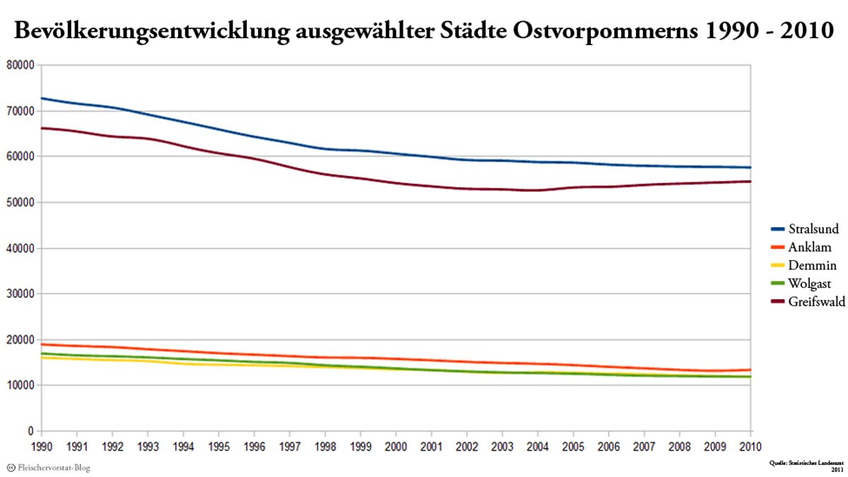 Ein Blick ins vorpommersche Umland verdeutlicht einmal mehr die Schrumpfung auf Raten, von der die meisten Städte und Gemeinden Mecklenburg-Vorpommerns betroffen sind. Während die Bevölkerung in Greifswald seit 2005 wieder wächst, verlieren benachbarte Städte wie Stralsund, Wolgast oder Demmin seit der Wende kontinuierlich Einwohner.