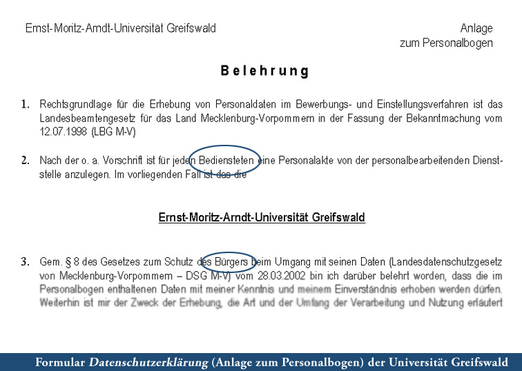Statt eine Entgenderung offizieller Texte zu fordern, wäre es darüberhinaus für die Sache der Geschlechtergerechtigkeit viel dienlicher, wenn sich die LGH zum Beispiel darum kümmerte, dass endlich auch die letzten Formulare der Universität geschlechtergerecht formuliert würden, wie zum Beispiel die Datenschutzbelehrung der Uni-Angestellten.