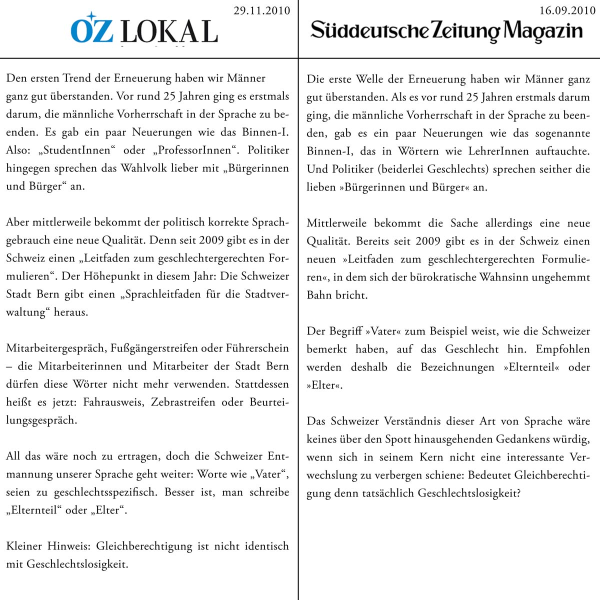 Beim Lesen von Christian Zaschkes Beitrag Entmannt. Warum muss der Mann verschwinden? Die neue Sprache der Gleichberechtigung soll ohne Geschlecht auskommen wird die Ähnlichkeit zu Torsten H.’s Text offensichtlich. Hier wurde also ungeprüft und ohne Quellenangabe übernommen. Praktizierte der Student diese Arbeitsweise auch bei der Anfertigung seiner Hausarbeiten, begäbe er sich ernsthaft in Gefahr, exmatrikuliert zu werden.