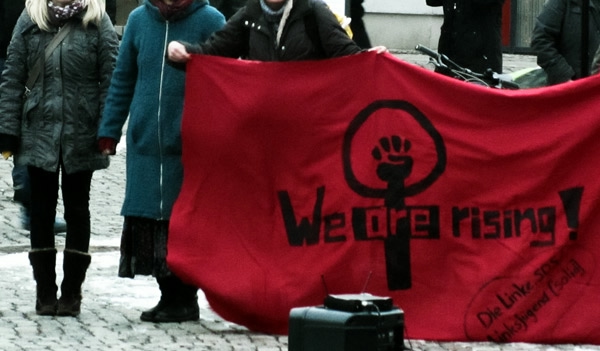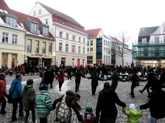 Etwa 180 Menschen folgten heute Nachmittag in Greifswald dem Aufruf zur Teilnahme an der weltweit stattfindenden Aktion One Billion Rising und protestierten gegen Gewalt gegen Frauen.
