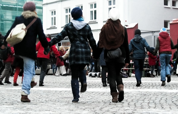 Den frostigen Temperaturen begegneten die Initiatorinnen mit einer Art Public Learning israelischer Volkstänze, für das sich zahlreiche Männer und Frauen erwärmen konnten, während anderen dieses Demonstrationsformat weniger zugänglich war.