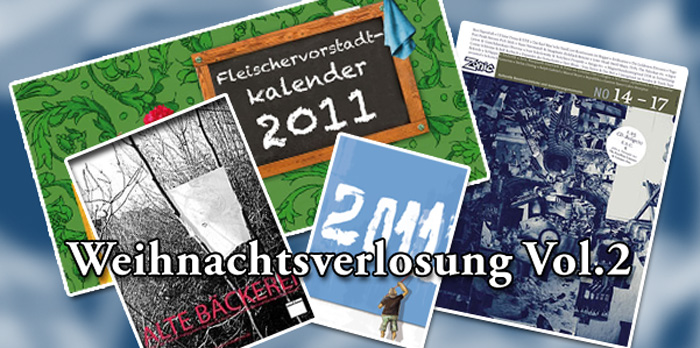 Gab es im letzten Jahr nur den Fleischervorstadt-Kalender zu gewinnen, sind jetzt gleich vier Preise unterschiedlicher Attraktivität im Jackpot und damit in greifbarer Nähe. Die Teilnahmeregeln sind simpel. Die einzige Bedingung, um bei der Verlosung dabei zu sein, ist das Hinterlassen eines wie auch immer gearteten Kommentars.
